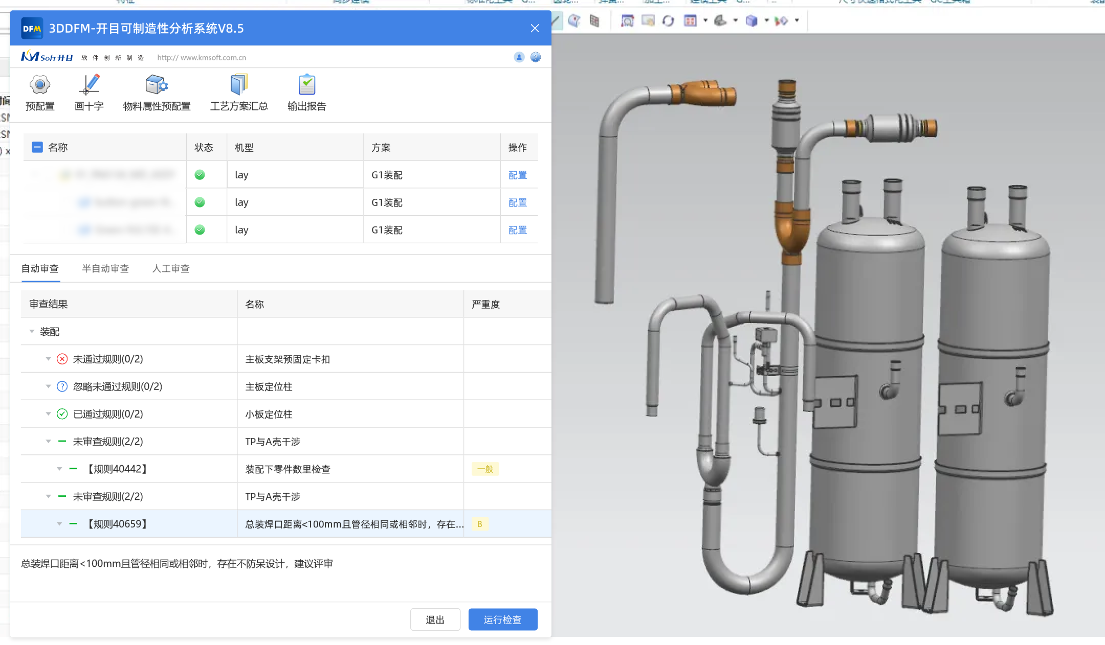 開目 3DDFM 8.0 新版本在家電行業對鈑金、注塑、裝配、配管、兩器等專業審查規則進行拓展開發,成功構建了家電行業審查知識庫,建立了家電行業工藝可制造性評審模型,并搭建了完整的工藝評審體系。該體系將結構化、規范化的可制造性標準前置至研發產品設計階段,使產品在開發設計之初就充分考慮到可制造性因素,實現一鍵式智能評審,極大地減少了評審過程中的人為工作量,大幅縮短了新產品研制周期。