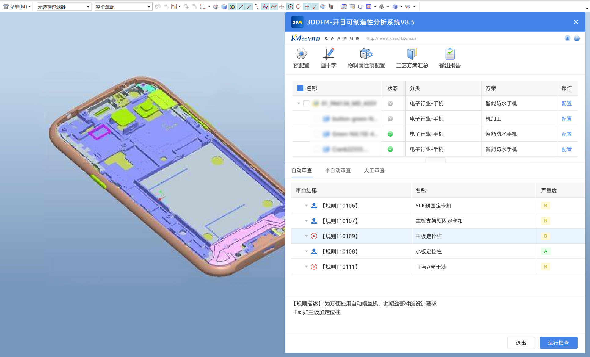 開目 3DDFM 8.0建立了覆蓋消費電子行業裝配、注塑、沖壓 / CNC、模切、焊接等專業領域的審查規則庫,能夠針對柔性屏、主板上蓋、下蓋 / 電池蓋、電池、接插件、按鍵、螺釘、FPC/PCB、指紋按鍵等關鍵部件進行全面檢查。同時,搭建了設計與工藝一體化協同體系,涵蓋工藝知識管理、方案優選、新品試制數據共享、審查結果一鍵輸出以及審查結果數據多維度智能分析等功能模塊,全方位提升了消費電子產品可制造性審查的效率。