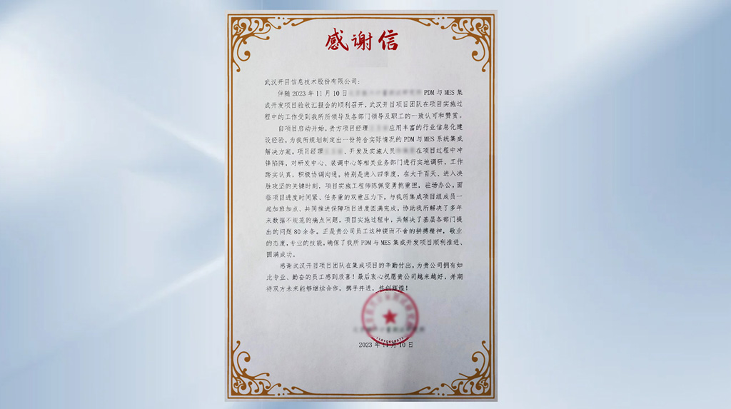 近期,在航天科工集團某研究所的 PDM與MES集成開發項目中,開目技術運維團隊在面臨項目進入決勝攻堅戰的關鍵時刻,頂住壓力,勇挑重擔,為客戶解決了多年來數據不規范的痛點問題以及其它部門提出的80多項關鍵問題,確保了項目的圓滿完成。運維團隊的專業性和責任心,獲得了客戶高度肯定和贊揚。