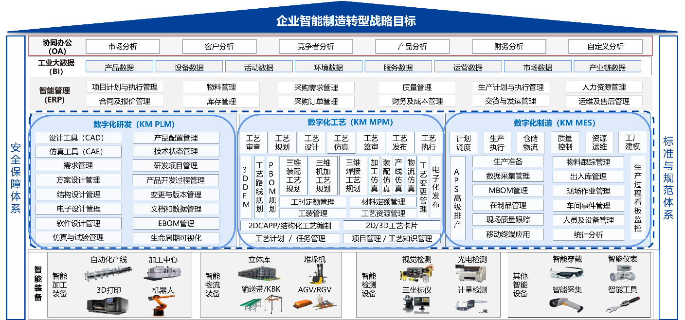 時至今日,開目公司已形成了完整的智能制造解決方案及高端工業軟件產品體系,包含KMPLM、KMMPM、KMMOM等一系列覆蓋產品研發、工藝設計、生產制造的一體化管理平臺以及以KMCAD、KMCAPP、KM3DDFM、KM3DAST、KM3DMPS、KM3DWELD、KM3DVIEWER為代表的研發設計類工具軟件產品,全方位助力中國制造企業向“中國智造”邁進。