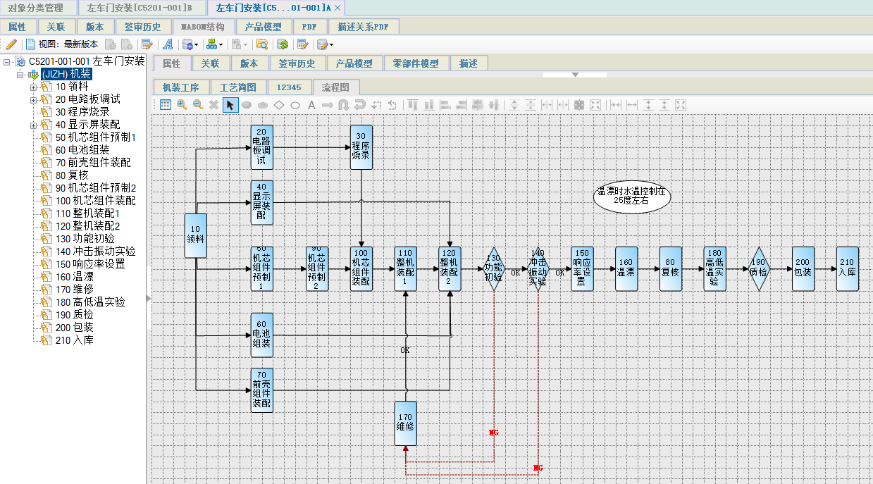通過在工序流程圖中增加回轉線、標注圖形、判定等圖形,能清晰和直觀的表達工序間的流轉。開目eCOL PLM 8.0新版本支持電裝、機裝、裝調等多專業的協同工作,支持自定義串行或并行的裝配過程,以及自動生成和輸出工序流程圖,用于生產車間的工作指導或展示等;支持在任意地方添加批注,醒目且直觀地體現工序流程圖的需注意事項;支持回退線用于滿足裝調等專業的調試需求,清晰地表達調試工藝過程中根據檢測結果來決定工序走向的情況。