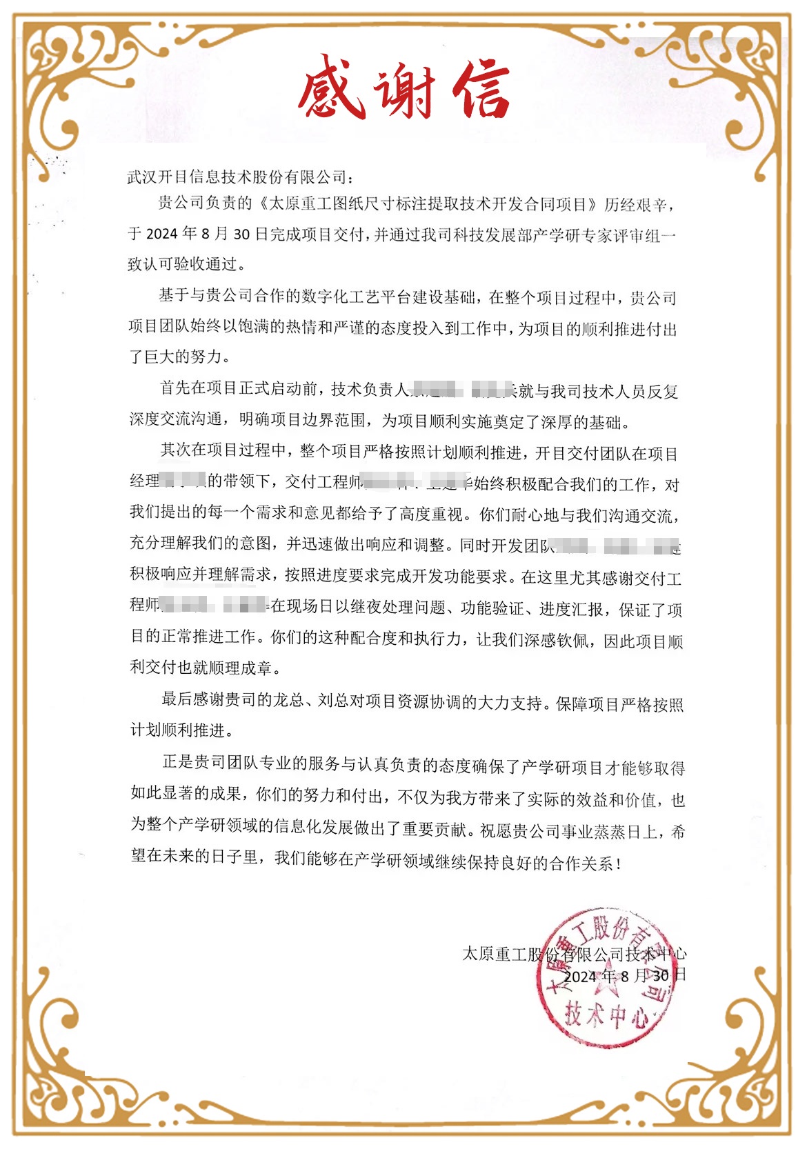 近日,太重集團圖紙尺寸標注提取技術開發(fā)項目順利驗收,項目組僅用3個半月便完成了企業(yè)尺寸標注提取系統(tǒng)的技術開發(fā),幫助企業(yè)提高了企業(yè)設計效率,縮短工藝文件及工藝技術準備周期。為此,太重集團向開目軟件發(fā)來感謝信,字里行間充滿了對開目提供的工業(yè)軟件技術、產(chǎn)品、方案與服務的肯定,同時對未來的合作前景進行了新的展望。